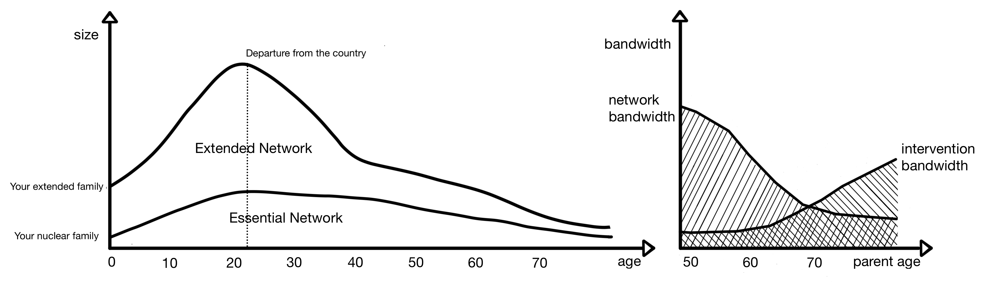 When you leave the country, you implicitly entrust your parent to both Essential and Extended Networks. This is fine when you’re twenty: your closest friends are probably your age, they have time to fill, and are eager to help. At the same time your parent is still young, probably in their fifties, and, if you’re lucky, they are mostly self-sufficient. To put it simply: your network has enough bandwidth while intervention costs and frequency are low.